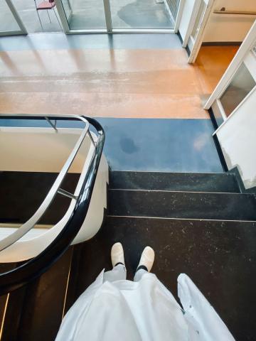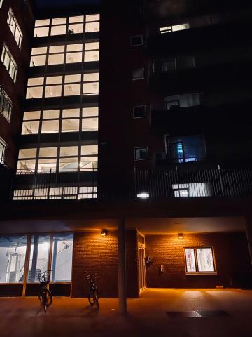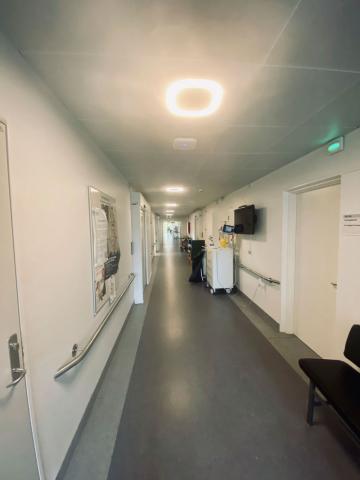 Tilbage klokken lidt i fire står jeg op for at gå det tilsyn, jeg er bestilt til. På med kitlen, ud på gangen. Alene på hospitalet, føler jeg. Krydser uden for fra bygning til bygning på vejen mod akutmodtagelsen. Solen står snart op, kan man fornemme. Jeg kommer ned i akutmodtagelsen og kan mærke, at de har haft en hård nat. Der ligger stadig usete patienter i sengene.