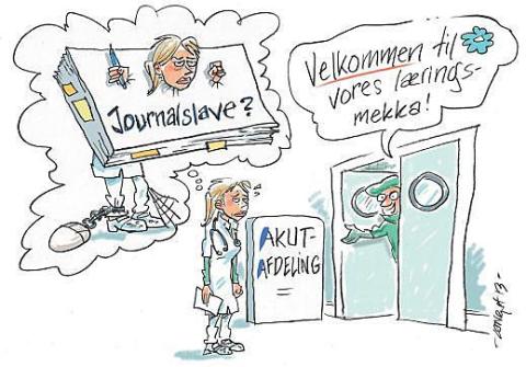 Journalslave – et ofte anvendt udtryk om den yngste læge i front. Der skal dokumenteres formalia – for patienten skal videre, stuen skal tømmes, og journalen skal skrives. På trods af nytænkningen af modtagelsen af akutpatienten og anbefalinger om uddannelse i akutafdelingerne fra f.eks. Videreuddannelsesregion Nord [3] fortsætter især de ældste cirkusheste med at fastholde det omstændelige journalkoncept og den yngste læges rolle i modtagesituationen. Har man i de mangfoldige løsninger på organiseringen af akutafdelingerne tænkt på læringsbehovet? Og tog supervisionen med, da KBU-lægen blev flyttet til akutafdelingen? Rekrutteringen af seniorlæger halter bagefter udviklingen af akutkonceptet [4] og spænder ben for opbygningen af det faglige miljø med et dertilhørende rum for læring. Så længe akutafdelingerne er i etableringsfasen, og de eksisterende afdelinger hverken kan eller vil slippe patienterne i modtagelsen, kan og må de heller ikke slippe uddannelsen af de yngste læger.