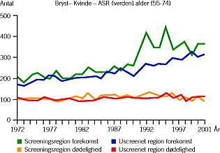 Samtidig sker der en markant stigning i den registrerede hyppighed af sygdommen i hele screeningsperioden som udtryk for, at indsatsen afslører et stort antal symptomløse tilfælde (denne statistik handler kun om invasiv brystkræft - hvis screeningens overskud af carcinoma in situ også blev medregnet, ville den registrerede stigning naturligvis blive endnu større).