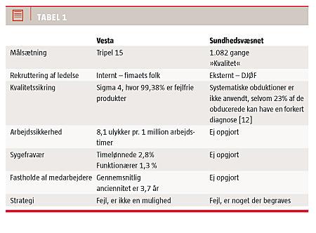 Begreberne »rekruttering« og »fastholdelse« indgår ikke i Kvalitetsmodellen [5]. Sundhedsvæsnet er også en stor kompleks organisation, men i modsætning til Vestas rekrutterer Sundhedsvæsnet ofte eksterne ledere fra Danmarks Jurist- og Økonomforbund, DJØF. Bestyrelsesformanden for kvalitetsmodellen Jesper Fisker, den nye direktør for modellen Jesper Gad Christensen, og sundhedsvæsnets øverste chef, minister Bertel Haarder, er alle DJØF'ere [7-9]. Tidligere i sin karriere stod Haarder bag et reduceret optag på medicinstudiet og skabte den nuværende mangel på nøglemedarbejderne - speciallægerne [10].