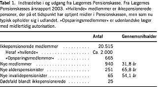 Af Tabel 1 fremgår ligeledes, at gennemsnitsalderen for indgang i Lægernes Pensionskasse var 31,8 år. Gennemsnits-alderen for alderspensionering var høj, nemlig 65,8 år.