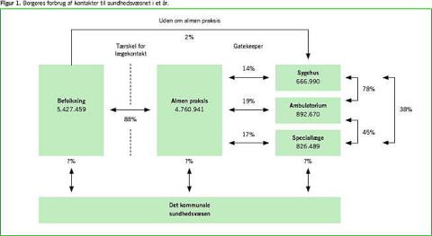 Følger man den danske befolkning i et år, fordeler forbruget af ydelser sig som i Figur 1 . På trods af at den praktiserende læge i den enkelte konsultation kun henviser ca. 10% til det sekundære sundhedsvæsen, er forbruget af det sekundære sundhedsvæsen, herunder speciallæger, ganske betydeligt.