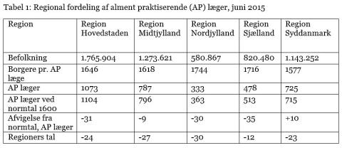 Hvordan ville lægedækningen i Danmark se ud, hvis der fortsat skulle være én praktiserende læge pr. 1.600 indbyggere? Det er udregnet i Tabel 1 og sammenholdt med DR Nyheders tal fra regionerne. Oplysninger om de faktiske lægetal er indhentet enten direkte fra regionerne eller fra deres praksisplaner. Beregningen viser, at tallene fra Region Hovedstaden og Region Sjælland undervurderer lægemanglen, sandsynligvis pga. inddragelse af ubesatte ydernumre. Derimod svarer beregningen til tallet fra Region Nordjylland, som tilsyneladende ikke har inddraget ubesatte ydernumre. Noget overraskende overvurderes lægemanglen af Region Midtjylland og Region Syddanmark. Sidstnævnte har som eneste region et relativt overskud af praktiserende læger, men har angivet at mangle 23 læger.