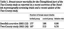 <li>Nyström L, Andersson I, Bjurstam N, Frisell J, Nordenskjöld B, Rutqvist L. Long-term effects of mammography screening: updated overview of the Swedish randomised trials. Lancet 2002; 359: 909-19.</li>