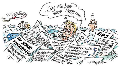 Mens de private sygehuse storsmilende sejler derudad og plukker lige præcis det, der skæpper i kassen, fra behandlingspaletten, uden at nogen i sundhedsapparatet stiller blot et minimum af sammenlignelige krav til dem, overdænges vi på de offentlige sygehuse med forkastelse af velfungerende arbejdsgange, idelige strukturreformer, Toyota- og andre managementmodeller, såkaldt værdibaseret ledelse og intetsigende MED-udvalg. Mens sekretærerne, som er selve krumtappen i vores interne kommunikation, på tværs af sygehusene og med patienterne, udfases, opleves hverdagen på hospitalet mere og mere som en ørkenvandring i irrelevant registrering med ubegribelige formularer og nye elektroniske snitflader. Disse er som hovedregel skabt af edb-nørder langt væk fra klinikken. Men arbejdet lider også af så simple ting som manglende single log-on til alle programmerne og af uendeligt langsomme computersystemer, som i sig selv stjæler tid fra patienterne. Hvis dette scenarium synes præget af mørke skyer, er det imidlertid for intet at regne i forhold til den stormende supercelle, som truer i den umiddelbare horisont: »Den danske kvalitetsmodel«. Udviklet af Institut for Kvalitet og Akkreditering i Sundhedsvæsenet (IKAS) (læs: www.ikas.dk) venter der os nu et politisk sanktioneret overregionalt statsligt kontrolorgan, som bygger på fjerne, men glansfulde termer som akkreditering, kvalitetssikring, validering og indikatorer. De lykkeligt ansatte i IKAS kan snart se frem til vellønnede livstidsstillinger, hvor de med et utal af audit og afkrydsningsskemaer i den ene hånd og spanskrøret i den anden fremover hvert tredje år skal godkende samtlige landets kliniske afdelinger.