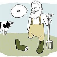 »De var vældig gæve på sygehuset, Hans. Der kom læger og sygeplejersker og alle mulige andre, og alle var flinke. Men de læger ... først kom der et par knoglelæger, som sagde: 'Ja, vi skal jo lave dit ben, det kan vi enten gøre med et marvsøm, vi kan sætte et par pinde ind i benet over for og neden for bruddet og nogle holdere, som holder benet, til det er groet sammen. Endelig kan vi også lægge det i gips. Hvad mener du selv?' Bagefter kom narkoselægerne, og også de var vældig gæve: 'Jo, vi kan lave en lokalbedøvelse oppe ved lysken eller en rygmarvsbedøvelse, eller du kan komme i fuld bedøvelse!' Jeg skulle acceptere og give mit samtykke. Jamen for fanden Hans, jeg ved en masse om får og kvæg (på landet hedder det ikke køer), men jeg ville da godt nok ønske, de bare var kommet og havde sagt, nu gør vi sådan og sådan, og så kan du køre traktor igen efter x antal uger. Alt det information gør jo en tummelumsk, og jeg har da spekuleret på, om de egentlig ved, hvad de vil, når de har sådan en som mig«.
