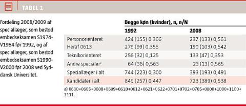 Ud fra fortegnelsen over læger fra Syddansk Universitet [3] har jeg derfor prøvet at beskrive deres fordeling på specialer i 1992 og 2008, idet denne fordeling nok også er indgået blandt de forbilleder, som artiklens unge studenter har haft. Fortegnelsen er senest ajourført i 2008-2009. Der findes ikke lignende tal fra Københavns Universitet og Aarhus Universitet.