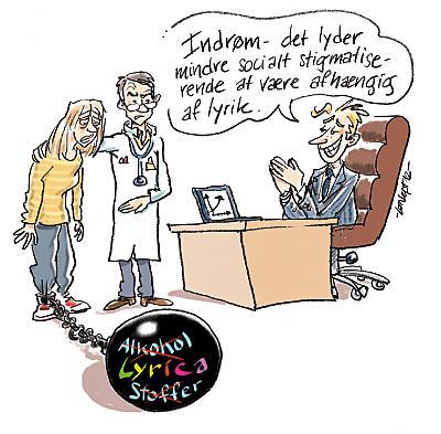 Hvordan har det været muligt for Pfizer at skabe et så stort marked på få år? I samme periode er mange blevet udtrappet af deres benzodiazepinmisbrug. Er det de samme patienter, der ender på Lyrica? Hvis det er tilfældet, er det tragisk, at et misbrug bliver afløst af et andet. Der er allerede over 20.000 danskere, der får Lyrica, og jeg vil gerne opfordre alle mine kolleger til at være opmærksomme på, at dette stof måske ikke er så uskyldigt, som navnet antyder. Efter en række cases samt en gennemgang af udbredelse på internettet advarer Medicin.dk også om risiko for misbrug.