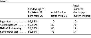 Hvis man indsætter tallene i en 2 x 2 tabel, kan man beregne resultatet af de forskellige test. Resultatet af beregningerne fremgår af Tabel 1 . Ved invasive undersøgelser antager man, at indgrebet i ca. 1% af tilfældene medfører abort.