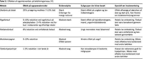 På befolkningsniveau er der dokumenteret og god effekt af flere typer rygepolitik [4] (Tabel 2 ). Rygeforbud på offentlige steder har vist sig at være gennemførligt, have god opbakning også blandt rygere og medføre fald i rygeprævalensen. Indgrebene i offentligt rum har ikke, som frygtet af nogle, haft negativ effekt på restaurationsbranchen. Øgning i pris på cigaretter medfører fald i tobaksforbrug, mens fald i pris medfører øgning i tobaksforbrug. Forbud mod tobaksreklamer og øget pris på tobak har størst effekt på rygere med lav socioøkonomisk status og er dermed med til at udligne den sociale ulighed. Nogle steder har man haft stor succes med »øremærket tobaksskat«, som, ud over at nedsætte rygeprævalensen, også direkte finansierer hjælp til rygeophør. Konsekvent gennemførte forbud mod tobaksreklamer har også effekt. Telefonhjælpelinjer og kampagner i medierne synes at have god effekt, men rygerne skal gøres opmærksom på deres eksistens. Store randomiserede befolkningsbaserede rygestopprogrammer har vist en positiv trend, men sjældent en signifikant effekt.
