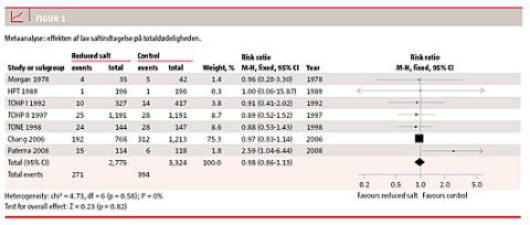 I en nyligt publiceret artikel kritiserer Ibsen & Jørgensen (Ugeskr Læger 2012;174:637-9) en metaanalyse, der viser, at saltreduktion ikke reducerer kardiovaskulær morbiditet og mortalitet. Denne kritik er netop karakteriseret ved, at mulige bivirkninger til saltreduktion ikke berøres. Ibsen & Jørgensen fremhæver i deres kritik en af He & MacGregor formuleret kommentar til metaanalysen. Fra metaanalysen summerer He & MacGregor de kardiovaskulære morbiditetsdata fra både raske og hjertesyge i én analyse og kan så fremtrylle en signifikant p-værdi til fordel for saltreduktion. Denne summering er baseret på en udkommevariabel (kardiovaskulær morbiditet), der kun er opgjort i fire af de i metaanalysen inkluderede syv arbejder, og er således ikke repræsentativ for metaanalysen. He & MacGregor kunne i stedet have summeret totaldødeligheden, der er opgjort i alle syv arbejder. Denne ikkeselekterede variabel udviser ingen forskelle mellem lav saltindtagelse og normal saltindtagelse (Figur 1), heller ikke selv om man ekskluderer studiet med hjertesyge patienter (Paterna 2008, Figur 1) (relativ risiko = 0,95 [95% konfidens-interval: 0,83-1,10], p = 0,51).