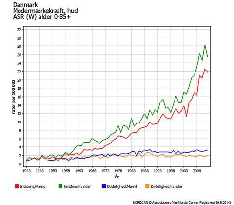 Forekomst og dødelighed pr. 100.000 af modermærkekræft blandt mænd og kvinder i Danmark Fra: NORDCAN (http://www-dep.iarc.fr/NORDCAN/DK/frame.asp).
