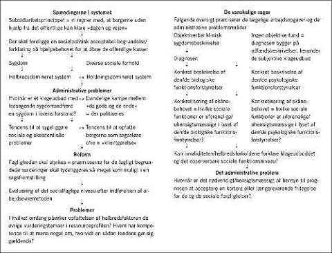 Konklusioner: 1) Ankestyrelsen bør vejlede kommunerne om, hvordan man lever op til lovgivningens forklaringskrav. 2) Der er brug for at gøre det begribeligt for de politiserende embeds-m/k i Socialministeriet (ingen lovhjemmel for de indskrænkende direktiver [2]), at det i en situation, hvor helbredshensynet fortsat er hovedbegrundelsen for at tilkende både midlertidige (sygedagpenge, revalidering) og varige ydelser (fleksjob, førtidspension), er meget lidt hensigtsmæssigt af hensyn til det faglige niveau i systemet at ekskommunikere den kliniske socialmedicin, som reelt er den eneste fagdisciplin, som har lidt forstand på den biologiske, sociale, kulturelle og individualpsykologiske baggrund for »de vanskelige sager«. 3) Klinikere bør tilskyndes til at overveje rationalet for det tvivlsomme budskab, at »hverdagslivets helbredsproblemer« gør det hensigtsmæssigt at anbefale relativt langvarige tilbagetrækningsreaktioner.