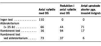 Jeg takker Ugeskrift for Læger for at give mig mulighed for at kommentere Niels C. Heebøll-Nielsens indlæg, som er meget relevant pga. Etisk Råds forslag om kun at tilbyde risikovurdering til gravide over 35 år (»kombineret test ved alderskriterium«). Da jeg finder, at Niels C. Heebøll-Nielsen har anvendt lidt forkerte forudsætninger, har jeg tilladt mig at komme med et kvalificeret skøn baseret på data fra »Fosterdiagnostik og risikovurdering«, (www.sst.dk/publ/publ2003/fosterdiagnostik.pdf). Som Niels C. Heebøll-Nielsen rigtigt refererer, er de foreløbige erfaringer fra H:S og fra Skejby Sygehus bedre end forudsat nedenfor, idet detektionsraten er højere, og specielt fordi falsk positivraten er lavere. Det skyldes formentligt, at Statens Serum Institut har leveret en usædvanlig god dobbelt-test, samt at nakkefoldsskanningerne på disse fødesteder er udført af certificeret personale på godt apparatur.