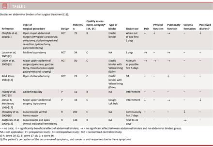 Results: A total of 50 publications were identified; 42 publications were excluded leaving eight publications counting a total of 578 patients for analysis. Generally, the scientific quality of the studies was poor. Use of abdominal binder revealed a non-significant tendency to reduce seroma formation after laparoscopic ventral herniotomy and a non-significant reduction in pain. Physical function was improved, whereas evidence supports a beneficial effect on psychological distress after open abdominal surgery. Evidence also supports that intra-abdominal pressure increases with the use of abdominal binders. Reduction of pulmonary function during use of abdominal binders has not been revealed.