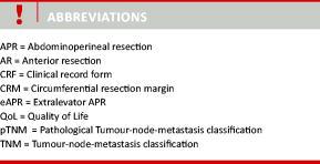 Local recurrence in rectal cancer is a disaster for the patient and the higher recurrence rate and inferior overall outcome for patients treated with APR – as compared with AR – have been and remain the focus of much of clinical rectal cancer research [14].
