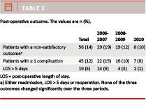 The proportion of patients in this study with a non-satisfactory outcome (readmissions, reoperation or LOS > 5 days) was 14%. This is relatively high compared with other studies, especially in terms of complications, where others have found a complication rate below 5% [12]. However, the non-satisfactory outcome rate is slightly lower than the 18% rate reported in the previous Danish study [2].