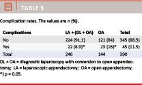 OA had more perforated events than DL (40% versus 21%). A normal appendix was removed in 25 (17%) patients in the OA group; in the DL and DL + OA group, only eight (3%) normal appendixes were removed (p < 0.01).