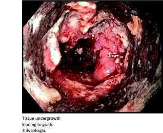 After discharge, all patients were given access to a hotline and instructed to make contact in case of renewed dysphagia. If the dysphagia was scored 2 or above, a new endoscopy would be scheduled within a couple of days. If tissue overgrowth was encountered during the re-interventional procedure, argon-plasma coagulation (APC) would be applied and a second SEMS would be considered only in case of a clear stenosis.