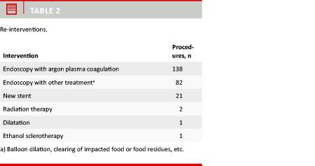 The 87 patients had a total of 251 hospital stays of which 245 were due to dysphagia or other SEMS-related complications. In 66 cases (27%), the re-interventions were carried out in an outpatient setting.