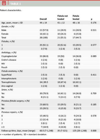 The success rate per patient was 45.9% (17/37) and the success rate per procedure was 44.7% (17/38). A total of 40 fistulas were treated with the AFP, and the success rate per fistula was 47.5% (19/40) (Table 2).