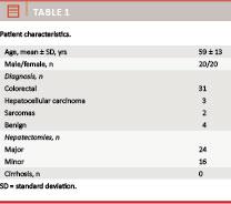Material and methods: A total of 40 consecutive patients having a liver transection performed by an RFA single electrode from 1 September 2011 to 28 February 2012 were included in the study. Data concerning type of liver resection, liver parenchyma transection time, intraoperative bleeding and transfusions were prospectively recorded and registered. Furthermore, complications were recorded with special emphasis on bile fistulas and abscesses.