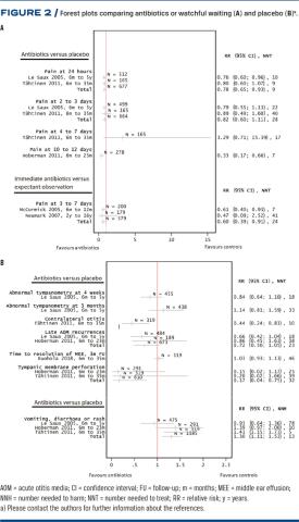 Confidence intervals and p-values were extracted. Data were analysed [13]. Forest plots were created comparing ABX or watchful waiting and placebo. Relative risk (RR), 95% confidence intervals (CIs) and numbers needed to treat (NNT) are shown in Figure 2A + B.