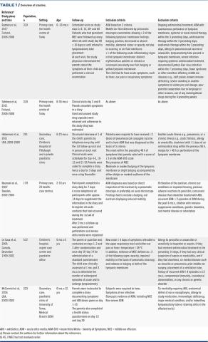 No significant differences were noted on tympanometry at four weeks and three months in patients treated with ABX versus those not treated [17]. On the other hand, a trend was observed towards ABX reducing late AOM recurrence and time to resolution of middle ear effusion.