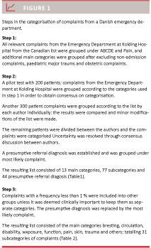 For the future management of patient flow in the ED, it is important to know at an aggregated level why the patients are referred. Such knowledge will underpin the planning of staff allocation and the development of diagnostic packages in the ED. Furthermore, for comparison of the different EDs, a certain consistency in the usage of categories of complaints is warranted. We have presented a first proposal. However, the categorisation has not been evaluated in other Danish EDs yet, and further studies from other EDs are requested. Based on the experiences from our study, we suggest that future studies include EDs where other patient groups are admitted, including, among others, children or pregnant women, and EDs with more experienced and specialised ED health staff in the study group. We also recommend using a prospective, structured collection of complaints from in- as well as outpatients in the ED and to evaluate the inter-observer variation. A standardised list of complaints is of interest for health professionals as well as health planners and needs continuous improvements, a task that may be best undertaken by a centralised national stakeholder.