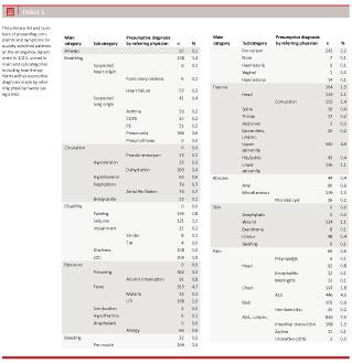 Material and methods: This was a cross-sectional study of all acute patients admitted to a Danish ED in 2010. Information was collected from electronic screens where the ED nurses registered the presenting symptoms or complaints according to the referring doctor or patient. A list of complaint categories covering all patient complaints was produced. Presumptive diagnoses and categories with frequencies less than 1% were pooled with other groups, unless keeping them was clinically relevant.