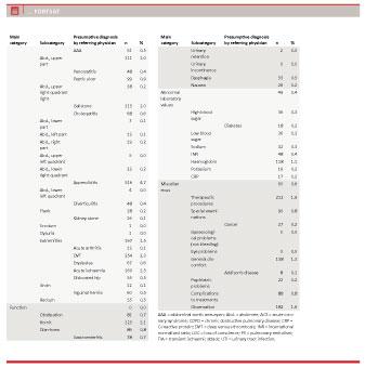 Results: Among the 9,863 patients, 49% were medical, 31% surgical, 15% orthopaedic and 5% vascular surgical patients. In 35% of cases, the patients were referred with a presumptive diagnosis, in 65% with a complaint or a symptom; and 11,031 complaints were placed in 13 main categories, 77 subcategories and 44 presumptive diagnoses. This aggregation resulted in 99 groups holding less than 1% of the patients’ complaints. Further aggregation resulted in 31 categories covering 93% of the complaints. Of the complaints not covered, the largest groups were patients with postoperative complications and special examination for various diseases (5%).