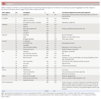 Introduction: In the emergency departments (ED), a heterogeneous mix of patients is seen. The aim of this study was to establish a limited number of categories of complaints and symptoms covering the majority of admissions in a Danish ED and to quantify the volume of cases in each category.
