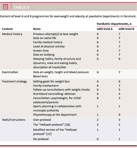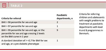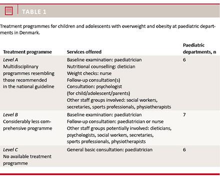 Methods: Telephone interviews with all Danish paediatric departments were conducted in 2014. The results, constituting a baseline, were analysed using the clinical guidelines for overweight and obesity published by the Danish Paediatric Society’s Overweight Committee in 2015.