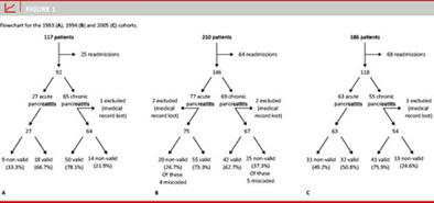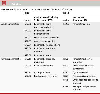 Materials and Methods: All admissions at Hvidovre Hospital coded in the NPR in 1983, 1994 and 2005 with a diagnosis of either acute or chronic pancreatitis were included. After exclusion of readmissions, the cohorts consisted of 92, 146 and 118 patients, respectively. Medical records from every admission were retrieved, the aetiology was assessed and the coding of the diagnoses was related to internationally approved criteria.