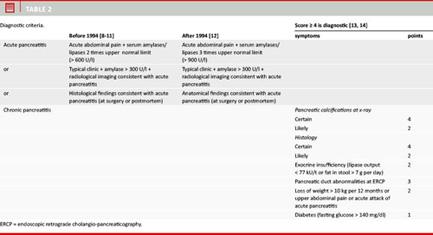 Because of the outspoken variation in their clinical and biochemical presentation, it may be difficult to diagnose acute and chronic pancreatitis. "The gold standard" is histology, which is rarely available. Several international symposiums have therefore been held within the past three decades with a view to establishing uniform diagnostic criteria for acute and chronic pancreatitis [8-12, 16, 17]. For acute pancreatitis, the diagnostic levels of the serum concentration of amylase or lipase have been raised from two times the upper normal limit to three times the upper normal limit [8-12, 16, 17]. In 1984, the Cambridge symposium [10, 11] facilitated the use of imaging modalities and per-operative findings as supplementary bases for the diagnosis (Table 2), whereas the Marseille criteria for chronic pancreatitis from 1963 were exclusively based on histopathology [16]. The later international symposiums in 1983, 1984 and 1988 added macro-morphological changes demonstrated by diagnostic imaging (US, CT, ERCP) and pancreatic function tests as diagnostic criteria, but the classification system remained of limited practical use [10, 11, 17, 18]. In the present study, the diagnosis of chronic pancreatitis was therefore based on a clinical scoring system described in 1994 by Peter Layer et al from the Mayo Clinic [13] (Table 2).