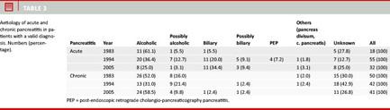 Results and Conclusion: Gallstone disease significantly (p = 0.04) increased as the cause of acute pancreatitis over the 22-year period, while alcohol remained the major cause of chronic pancreatitis. The validity of the diagnoses for patients with acute pancreatitis varied between 51% and 73%, and for chronic pancreatitis between 63 and 78%.