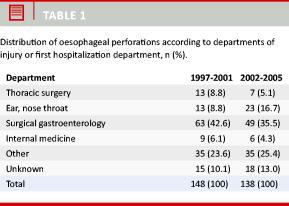 In the period 1997-2005, a total of 286 patients were diagnosed with perforation of the oesophagus.