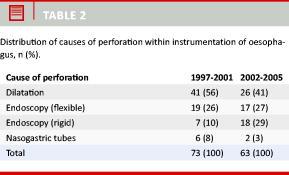 Conclusion: Oesophageal perforation remains a diagnostic and therapeutic challenge and the condition requires aggressive treatment. Recent consensus in early treatment with thoracotomy, debridement, irrigation and subsequent parenteral nutrition has improved survival. In this material, most perforations were iatrogenic in nature. In the 2002-2005 period, the study showed that 29% of the iatrogenic perforations were caused by the use of a rigid endoscope which is risky and whose use should therefore be restricted. It is advisable to set up national guidelines for treatment of oesophageal perforation and to centralise treatment.