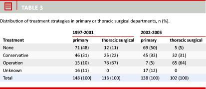 In the thoracic surgery departments, about 65% of patients underwent surgery including drainage of the pleura and primary surgical closure of the perforation through a thoracotomy, which in some cases was combined with a pleural or pericardial flap. A small number of patients were treated with T-tubes or surgery combined with stenting of the perforation. A few patients were treated by thoracoscopic surgery (VATS). A total of 29 patients had a resection of their oesophagus performed.