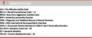The following measures were employed: The Mini International Neuropsychiatric Interview (MINI), which is an abbreviated and structured psychiatric interview that -assesses the 15 major adult Axis I diagnostic categories of the DSM-IV [8]. The Structured Clinical Interview for the DSM-IV Axis II Personality Disorders (SCID-II), which identifies all DSM-IV personality disorders according to diagnostic criteria [9]. The Symptom Check List - 90 - Revised, a widely used self-report instrument [10] that includes nine subscales targeting specific domains of psychopathology as well as global severity. The Affective Lability Scale (ALS), which is a 54-item instrument [11] in which subjects rate their agreement with statements regarding the tendency of their mood to shift. The Barratt Impulsiveness Scale - 11 (BIS-11), which is a 30-item self-report questionnaire [12] designed to assess general impulsiveness. The Buss-Perry Aggression Questionnaire (BPAQ), a 29-item questionnaire aimed at measuring attitudes towards aggressiveness and its expression in everyday circumstances [13]; and, finally, the Toronto Alexithymia Scale Ð 20 (TAS-20), a self-report questionnaire designed to assess an individual’s level of alexi- thymia, i.e. the inability to read emotions [14, 15].