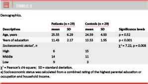 There was no significant age difference (p = 0.52) between patients (range 19.2-40.7 years; mean = 25.55 years; standard deviation (SD) = 6.3) and healthy controls (range 19.3-38.7 years; mean = 24.59 years; SD = 5.9) (see Table 1). Despite recruitment efforts, there was a highly significant difference between the socioeconomic status of patients and controls (χ2 = 7.22; p = 0.008). There was also a highly significant difference in educational level (p < 0.001) between patients (range 9-16.5 years; mean = 11.43 years; SD = 2.2) and healthy controls (range 10-17 years; mean = 13.53; SD = 1.9).