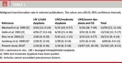 Comparing the present data with those reported by others is complicated since there are several systems of histological classification. We used the WHO classification. However, the most popular classification system in recent literature is laryngeal intraepithelial neoplasia (LIN) introduced by Friedmann et al in 1986 [14]. The LIN classification system corresponds to that applied in dysplastic lesions of the uterine cervix. Staging thus distinguishes between keratosis without dysplasia (KWD), keratosis with mild dysplasia (LIN 1), keratosis with moderate dysplasia (LIN 2), and keratosis with severe dysplasia or carcinoma in situ (LIN 3) [3]. Arguments for applying LIN include the fact that lesions characterized as KWD have been shown to be associated with an increased risk of invasive carcinoma development [4], and that the prognosis for severe dysplasia and CIS are similar [15]. The WHO and LIN classification systems are comparable despite their differences. Table I shows the data reported in the latest literature. KWD is left out of the comparison as it does not form part of the WHO classification.
