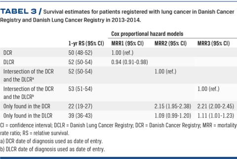 Results: In 2013-2014, a total of 9,111 Danish residents were identified with LC in the DCR and 9,316 were found in the DLCR. Merging the two registries showed an agreement of 87%, whereas 6% were included only in the DCR and 8% only in the DLCR. Including patients only registered in one registry, but who seemed to meet the inclusion criteria of both registries, would increase the agreement to 95%. No differences were seen for 1y-RS. However, MRR for patients in the DLCR was significantly lower than for patients in the DCR: 0.94 (95% confidence interval: 0.91-0.98).