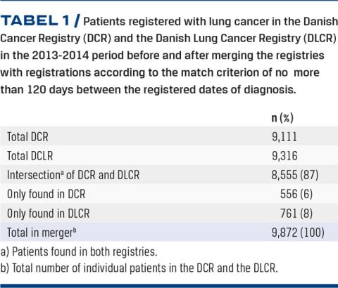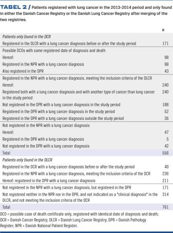 In the present study, 407 patients only found in the DLCR may have been candidates for inclusion in the DCR, and 240 patients only found in the DCR – according to registrations suffering from both LC and another type of cancer - may have been candidates for inclusion in the DLCR. The findings indicate that the capture algorithms have missed these patients. Alternatively, these patients may be under further investigation in the registries before inclusion. Such investigations may last several years. Either the DCR or the DLCR publishes the numbers of patients who are undergoing further investigation in their annual reports.