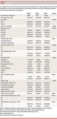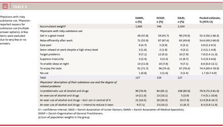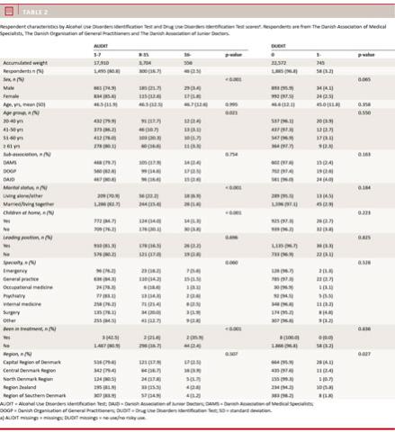 Methods: During the spring of 2014, a nationwide cross-sectional study was conducted as an anonymous, electronic survey among a randomly weighted sample of 1) consultants and practicing specialists, 2) younger physicians (trainees) and 3) general practitioners in Denmark. A total of 4,000 physicians (approx. 1,333 from each group) were sampled and 1,943 responded (49%). The survey included the Alcohol Use Disorders Identification Test on alcohol use and the Drug Use Disorders Identification Test on drug use and related questions on health and psychological issues.