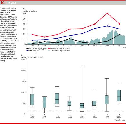 There was a significant increase in the number of patients waiting for an NMC-HCT in the 2006-2007 period (median 18, range 11-28) compared with 2000-2005 (median 6, range 1-14) (p < 0.001) (Figure 1A ). Although the number of NMC-HCTs performed annually increased from eight to over 30, the amount of referrals increased even more. This resulted in the waiting list peaking in 2006-2007. The number of patients taken off the waiting list without transplantation varied with the number of patients on the waiting list. It reached its maximum in 2007 when as many as 30 patients were transplanted while 18 patients were taken off the waiting list without transplantation.
