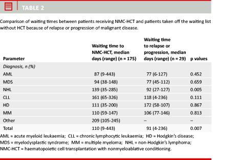 Results: Unrelated donor searches resulted in a suitable donor in 75% of cases of which 36% were transplanted. Among 244 patients referred for NMC-HCT, 72% were transplanted. There was a significant difference in the number of NMC-HCTs between national regions. Increasing waiting time resulted in 22% of the referred patients being taken off the waiting list without NMC-HCT.