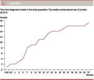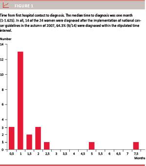 The median time from first hospital contact to diagnosis was one month. 66.7% of the women were diagnosed within this time frame (Figure 1). The median period from diagnosis to death was 12 months (Figure 2).