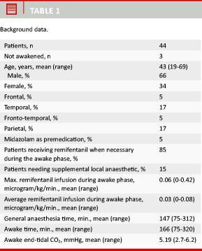 Oxygen saturation, electrocardiography, end-tidal CO2, invasive arterial blood pressure and diuresis are monitored. Hypotension is treated by means of ephedrine and phenylephrine. After anaesthesia induction, LA is performed. Next, the craniotomy is performed, the patient is awakened and the LM removed. Nasal prongs are placed to administer oxygen and monitor end-tidal CO2. An infusion of a small dose of remifentanil is started if the patient feels any discomfort. The cortex is mapped by the neurosurgeon in close co-operation with the neuropsychologist. Subsequently, tumour resection is carried out, guided by further intermittent mapping. If the patient develops neurological deficits, the tumour resection is terminated or redirected. This option is a major advantage of the AA technique compared to the AAA technique. It is only occasionally necessary to re-anaesthetize the patient during closure, thus reducing airway management compared to AAA. After the surgery, the patient stays at the intensive care department, typically for 24 hours. We retrospectively analyzed the 44 patients who were anaesthesized with the AA method from May 2004 to March 2009 at Glostrup Hospital. Background data are provided in Table 1.