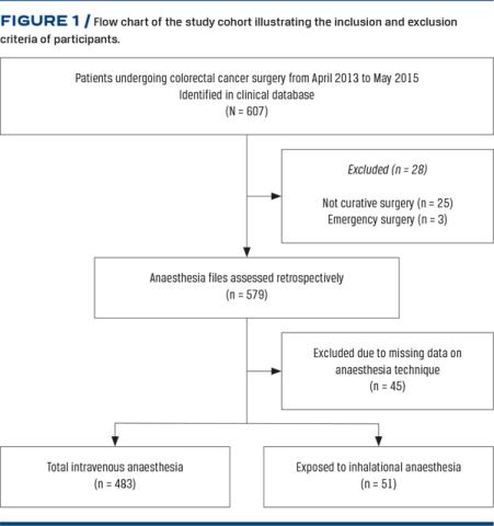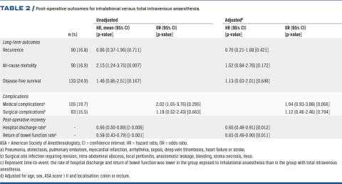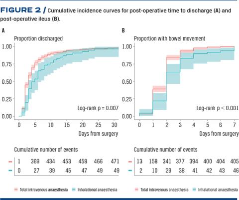 RESULTS: A total of 534 patients were included, 51 were exposed to inhalational anaesthesia and 483 had total intravenous anaesthesia. We found no statistically significant difference in recurrence (hazard ratio (HR) = 0.70; 95% confidence interval (CI): 0.21-1.68; p = 0.421). Patients in the inhalational aneasthesia group had a significantly lower chance of discharge per post-operative day (HR = 0.66; 95% CI: 0.48-0.91; p = 0.012). The same was seen for time to bowel movement (HR = 0.65; 95% CI: 0.46-0.90; p = 0.011). No statistically significant differences were seen for the other outcomes.